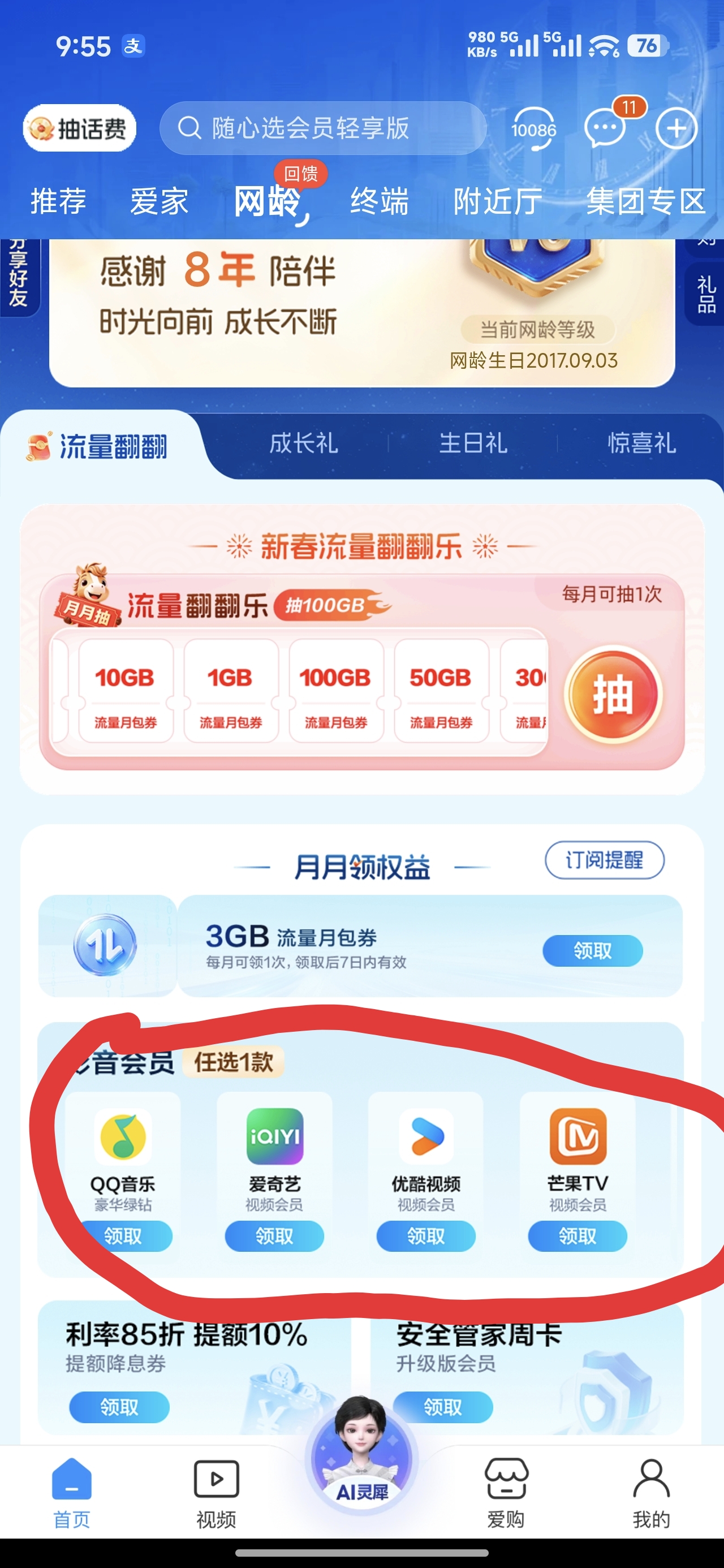 有可能网龄或者套餐消费不够,而没有领视频会员的福利。